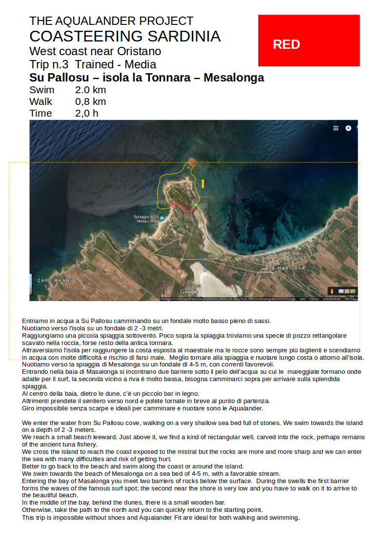 Discover yourself and your limits in the wild nature of Sardinia following the signs of the myth of Atlantis. From Su Pallosu's cove, we swim to the islet of an ancient tuna trap. We explore on foot Isla Tonnara, enter the water on the windward coast and swim in the open sea up to the splendid and wild beach of Mesalonga. Then we come back to the start always with Aqualander shoes that protect walking and help in swimming