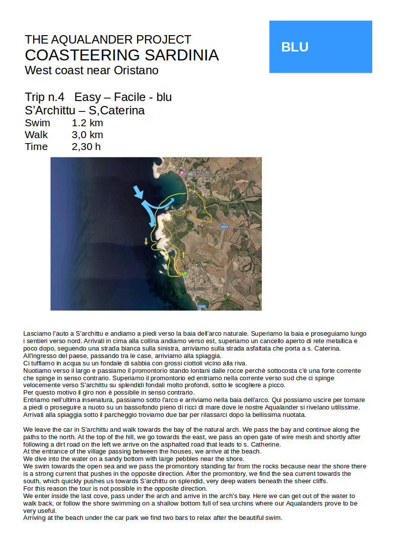 ITALIANO Lasciamo l'auto a S'archittu e andiamo a piedi verso la baia dell'arco naturale. Superiamo la baia e proseguiamo lungo i sentieri verso nord. Arrivati in cima alla collina andiamo verso est, superiamo un cancello aperto di rete metallica e poco dopo, seguendo una strada bianca sulla sinistra, arriviamo sulla strada asfaltata che porta a s. Caterina.